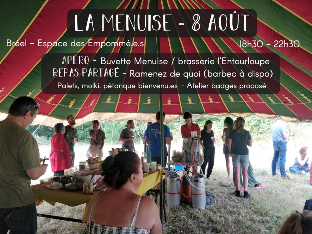 La Menuise organise un apéro/buvette avec la Brasserie l’Entourloupe ainsi qu’un repas partagé le 8 août. Cet événement convivial aura lieu à Bréel, espace des empommées (cliquez ici pour voir où ça se situe : https://goo.gl/maps/ydTvYyp9Lwz4uUvq5 ).
